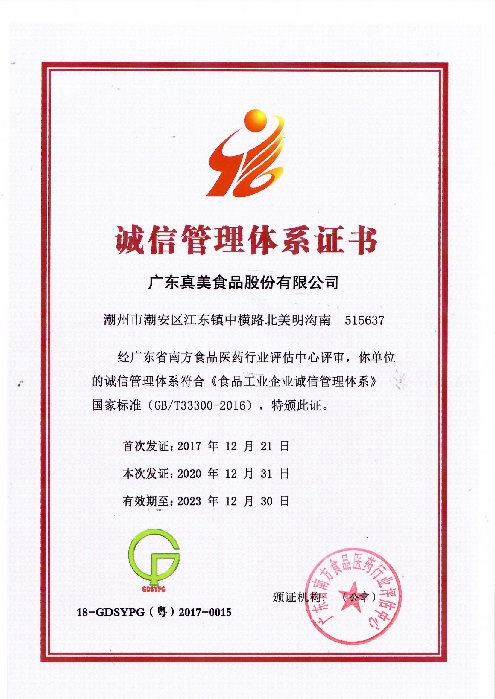 廣東真美食品股份有限公司誠信管理體系證書公示